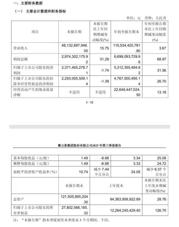 赛力斯公告显示,2025年第三季度实现营业收入481.33亿元,同比增长15.75%;归属于上市公司股东的净利润23.71亿元,同比下降1.74%;基本每股收益1.49元。累计来看,赛力斯前三季度实现营业收入1105.34亿元,同比增长3.67%;归属于上市公司股东的净利润53.12亿元,同比增长31.56%;基本每股收益3.34元。