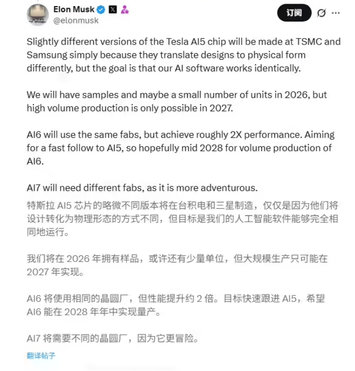 马斯克:特斯拉AI5芯片分为由台积电和三星电子代工制造,2026年试产,2027年大规模量产