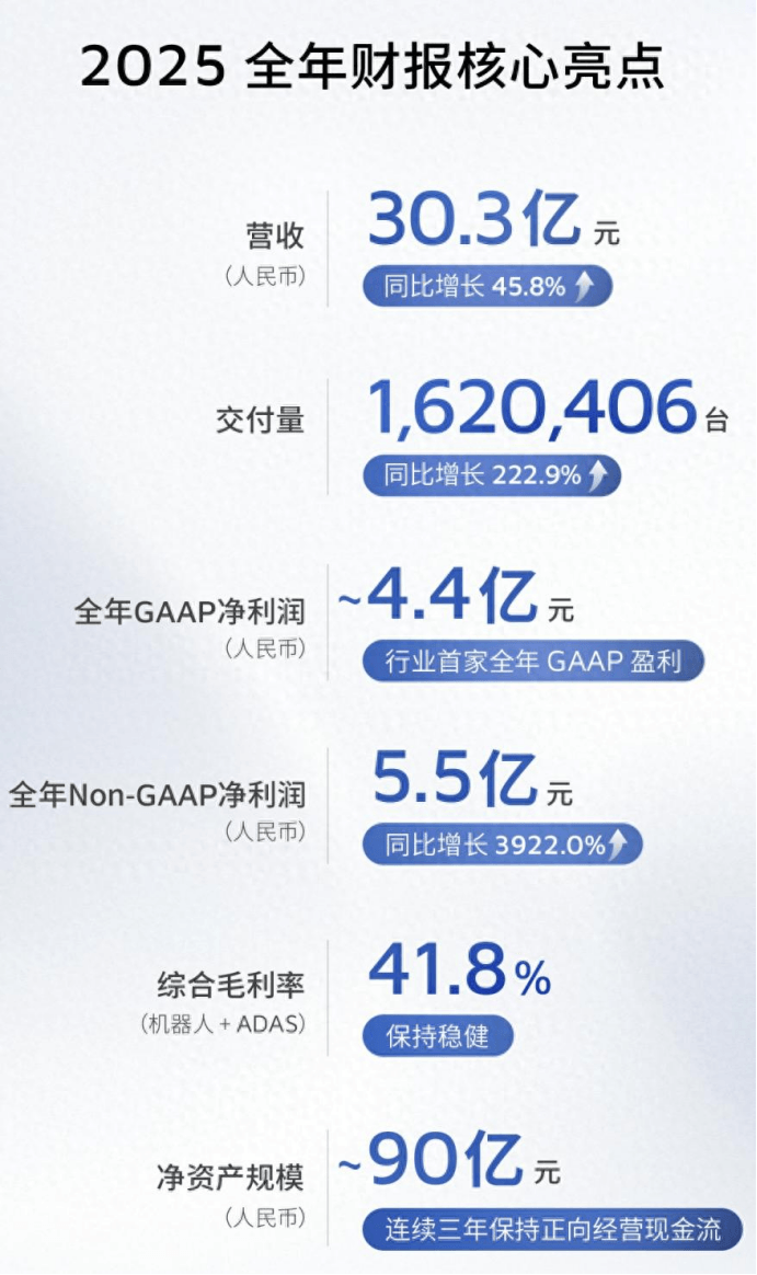 2025年全年,禾赛科技ADAS激光雷达出货量为1,381,133台,同比增加202.6%;机器人激光雷达出货量为239,273台,同比增加425.8%;激光雷达总出货量为1,620,406台,同比增加222.9%。禾赛是全球首个年产量突破100万台和累计量产并交付超200万台激光雷达的科技企业,2025年9月年度第100万台激光雷达量产下线,11月累计第200万台激光雷达量产下线并交付客户。