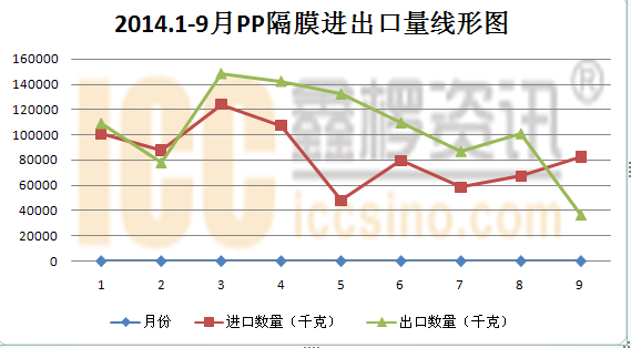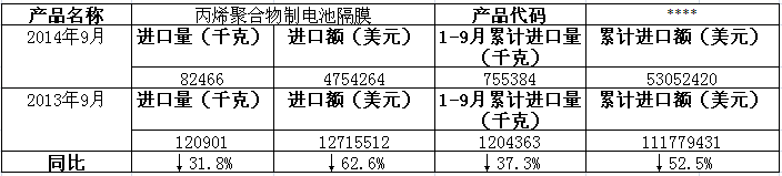 据海关统计,2014年9月,我国进口丙烯聚合物制电池隔膜共计82466千克,进口总额为 475万美元,出口数量为36704千克,出口额为 95.7万美元.本年度1至9月累计进口丙烯聚合物制电池隔膜量为755384 千克,累计进口额为 5305万美元。累计出口丙烯聚合物制电池隔膜量为944438,累计出口额为2097万美元。当月同比,进口量↓31.8%,进口额↓62.6%。详见下表。