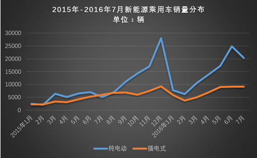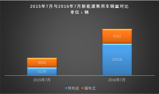 累计方面,2016年1-7月累计销量已达14.99万辆,其中纯电动乘用车销量达10.1万辆,占比达67%;插电式乘用车销量达4.9万辆,占比33%。