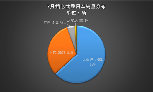 相对应的一直处于插电式乘用车领域绝对领先地位的比亚迪,7月销售5788辆,环比下降7.7%,市场份额继续下滑至63%。旗下主力车型比亚迪秦和唐销量分别为2756辆和3032辆,两车型各占市场份额30%和33%。其中,比亚迪秦基本与6月销量持平,唐则出现近500辆的减少。
