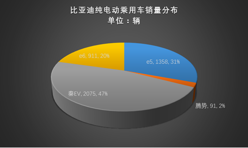 以4334辆的销量位居第二位的比亚迪,月度销量一至处于稳步小幅攀升状态,从1、2月份销售千辆到3月跨入月销3000辆的水平,4-7月持续稳增长,实现7月销售4000辆以上水平。比亚迪旗下纯电动车型主要主要有e6\e5\秦EV\腾势。四款车型销量中,秦EV7月销量中成为主力,秦EV车型销量增至2075辆,环比增幅近1倍。而定位高端市场的腾势车型销量不足百辆,维持6月水平。e6销量也滑至千辆以下,较之6月1647辆,减少超700辆。e 5销售1358辆。占比方面,e6\e5\秦EV\腾势分别为20%、31%、47%和2%。