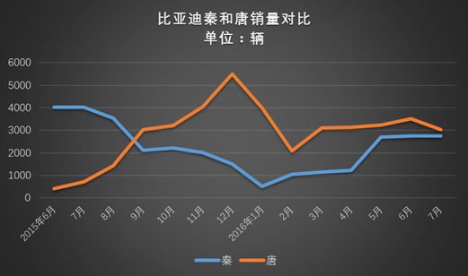 对比比亚迪秦、唐两款车型月度销量走势看,从2015年9月比亚迪秦产能开始偏向唐,使得比亚迪唐市场销量首次超过秦,后续唐持续发力,在去年12月实现月度销量达到最高值,(5503辆),使得两车型月度销量差距最大达近4000辆。而后从今年开始两车型销量逐步保持千辆差距,在今年5、6月份相差800辆以下水平,7月两车型销量基本交叉吻合。