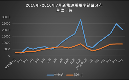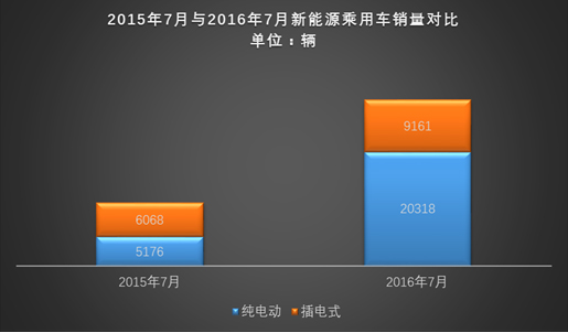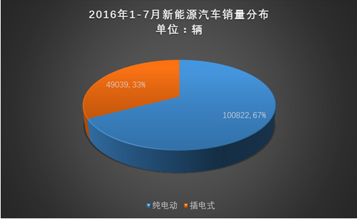 累计方面,2016年1-7月累计销量已达14.99万辆,其中纯电动乘用车销量达10.1万辆,占比达67%;插电式乘用车销量达4.9万辆,占比33%。