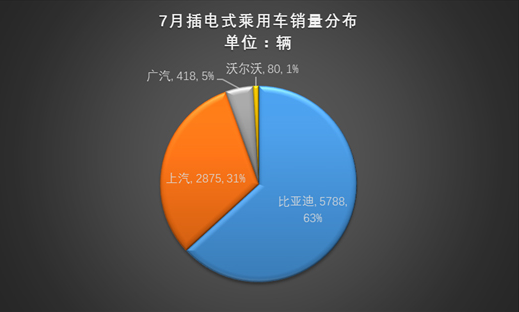 相对应的一直处于插电式乘用车领域绝对领先地位的比亚迪,7月销售5788辆,环比下降7.7%,市场份额继续下滑至63%。旗下主力车型比亚迪秦和唐销量分别为2756辆和3032辆,两车型各占市场份额30%和33%。其中,比亚迪秦基本与6月销量持平,唐则出现近500辆的减少。