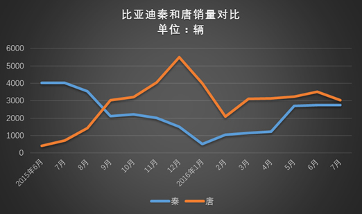 对比比亚迪秦、唐两款车型月度销量走势看,从2015年9月比亚迪秦产能开始偏向唐,使得比亚迪唐市场销量首次超过秦,后续唐持续发力,在去年12月实现月度销量达到最高值,(5503辆),使得两车型月度销量差距最大达近4000辆。而后从今年开始两车型销量逐步保持千辆差距,在今年5、6月份相差800辆以下水平,7月两车型销量基本交叉吻合。