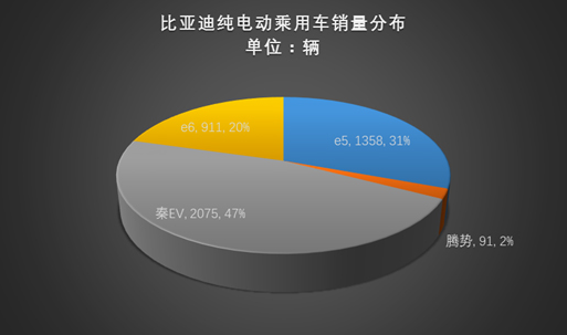 以4334辆的销量位居第二位的比亚迪,月度销量一至处于稳步小幅攀升状态,从1、2月份销售千辆到3月跨入月销3000辆的水平,4-7月持续稳增长,实现7月销售4000辆以上水平。比亚迪旗下纯电动车型主要主要有e6\e5\秦EV\腾势。四款车型销量中,秦EV7月销量中成为主力,秦EV车型销量增至2075辆,环比增幅近1倍。而定位高端市场的腾势车型销量不足百辆,维持6月水平。e6销量也滑至千辆以下,较之6月1647辆,减少超700辆。e5销售1358辆。占比方面,e6\e5\秦EV\腾势分别为20%、31%、47%和2%。