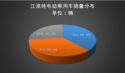 值得注意的是,江淮7月销售1033辆,旗下主力车型iEV 4 \iEV 5\ iEV 6S销量分布相对平均,分别为394辆和395辆、280辆。