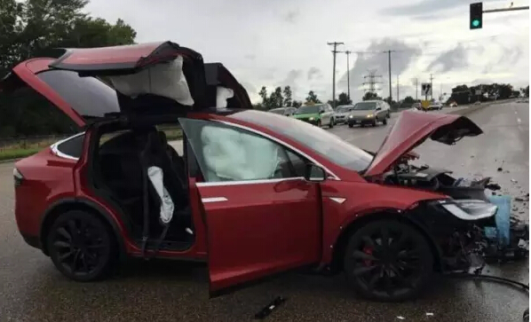 事故发生时,一辆GMC Yukon闯红灯,以45英里每小时的速度撞到了Model X车头的右侧。在车祸中,Model X的车身前头被削掉,足见撞击力度的猛烈。Model X的安全气囊均及时打开,保护了车内的乘员。