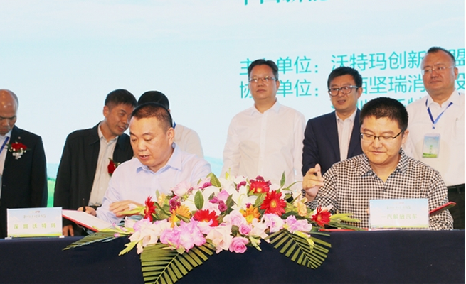 9月13日,沃特玛创新联盟与中国一汽集团在“中国新能源汽车产业高峰论坛”上签署合作协议,双方确定在纯电动物流车领域展开合作。一汽与沃特玛旗下的沃特玛电池蓝海华腾、华强电器、快车道等7家企业签约,揽获电池、电控、汽车空调等核心零部件合同,沃特玛创新联盟旗下的深圳运创租赁与一汽签署5000台纯电动物流车采购协议。这是自今年初新能源汽车产业进入平静期以来行业内一次标志性“破冰”成果。
