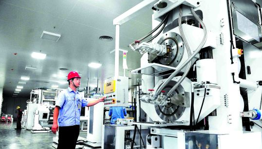 13日,在位于高新区的中航锂电(洛阳)产业园三期工程项目现场,技术人员正在调试锂离子动力电池切片涂装设备。