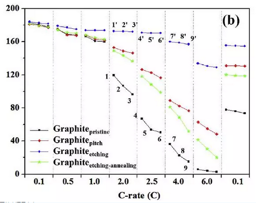 电化学测试表明,经过常温KOH处理的石墨材料相比于未经处理的石墨材料具有更好的倍率性能,在2.5C的充电倍率下,循环100次容量保持率达到96.7%,而未经处理的石墨材料容量保持率仅为50%左右,从0.1C到6C充电倍率的测试结果表明,经过KOH腐蚀处理的石墨材料倍率性能较没有处理过的石墨材料有了显着的提升,特别是在充电倍率高于2C时,优势十分明显。