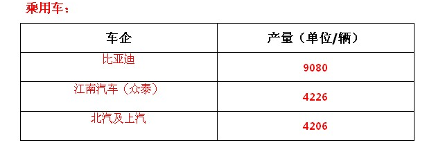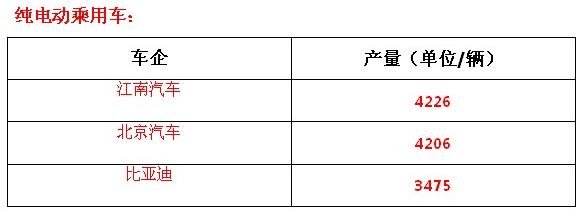 纯电动乘用车:江南汽车总产量达到4226辆,排名第一,北京汽车产量4206辆与比亚迪产量3475辆分别排名第二名和第三名。