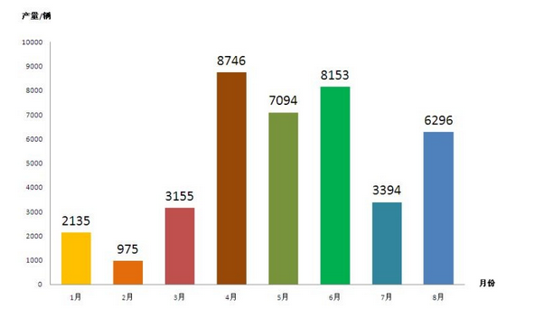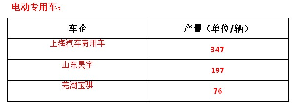 电动专用车:8月份产量并不理想,其中上海汽车商用车的产量为347辆、山东昊宇和芜湖宝骐产量分别为197、76辆,电动专用车在8月份的产量陷入低迷。
