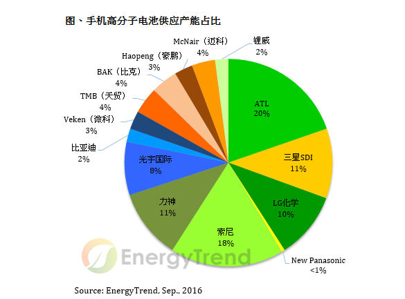 以锂电池种类来看,高分子电池具轻薄的特性,因而广受手机与笔电的欢迎。从2014年开始,随着手机竞争日趋白热化,再加上中国高分子电池供应链逐渐崛起,高分子电池在手机的使用比重显著提升,排挤方形电池的市占。EnergyTrend统计,2011年全球智慧型手机高分子电池使用占比仅约35%,2016年已高达70%。