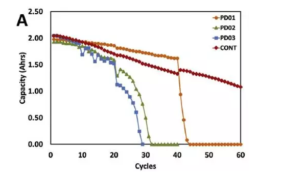 研究发现,在进行15C脉冲充放电时,电池最多经过40次循环后就无法进行15C充电,但是仍能够进行1C的充放电,其1C容量衰降速率为6%/20次循环。而进行15C连续充放电的电池,60次以后仍然能够进行连续的15C倍率充放电,但是其1C的容量衰降速度要明显高于脉冲模式,达到了14%/20次循环。