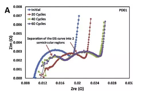 交流阻抗分析表明,随着电池脉冲放电的进行,电池的电荷交换阻抗和SEI膜阻抗持续增加,而电荷交换阻抗主要和电极活性物质与电解液接触界面的大小有关,SEI膜的增长既导致了SEI膜阻抗增加,也增加了电荷交换阻抗。