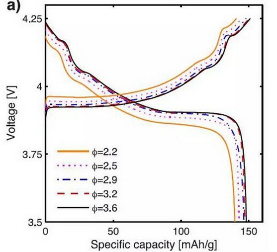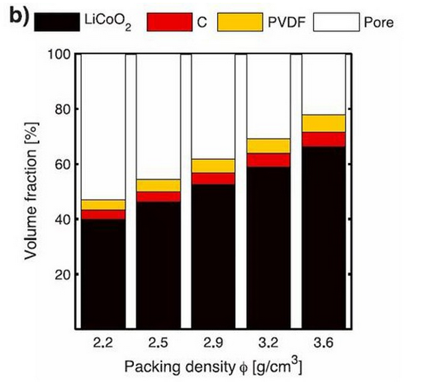 研究表明,即使压实密度达到3.6g/cm3,在4C的放电倍率下,锂离子扩散依速率然不是限制因素,进一步的研究发现,当孔隙率低于75%时,锂离子扩散速率并不是锂离子电池的倍率性能的限制因素。