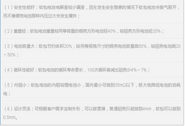 (5)内阻小:软包电池的内阻较锂电池小,国内最小可做到35mΩ以下,极大地降低电池的自耗电;