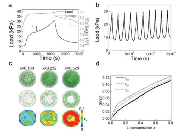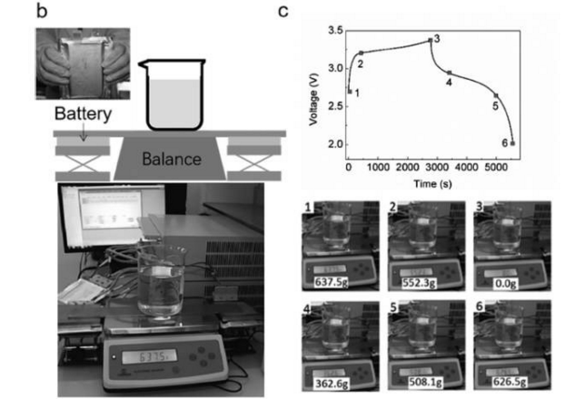 清华大学的Jialiang Lang等人就利用了硅负极在充放电过程中的体积膨胀开发了一款“微型起重机”。该“微型起重机”实际上是一个软包锂离子电池,其正极采用了体积变化很小的LiFePO4材料,而负极使用了硅负极材料,电池容量为2.1Ah。并利用该电池进行了“举水实验”,在实验中该电池通过充电“举起”了637.5g的水,在完全充电状态下电池膨胀所产生的压强达到了25.8KPa,在后续的循环过程中产生了平均21KPa的压力。后续的研究表明,该电池能够产生的最高压力可达17MPa。在整个充放电电压平台期间,该电池可以持续产生10MPa以上的压力。在该过程中,充电产生的能量分为3部分,一部分转化为机械能,一部分转换为化学能储存在电池中,一部分则转化为热能耗散了。