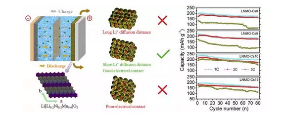 研究发现,当碳微球的添加量过少时,反而会造成富锂材料的纳米颗粒发生团聚,而碳微球过多时则会造成材料的颗粒过于松散,添加10wt%碳微球的富锂材料具有最好的循环性能、倍率性能和最少电压衰降。