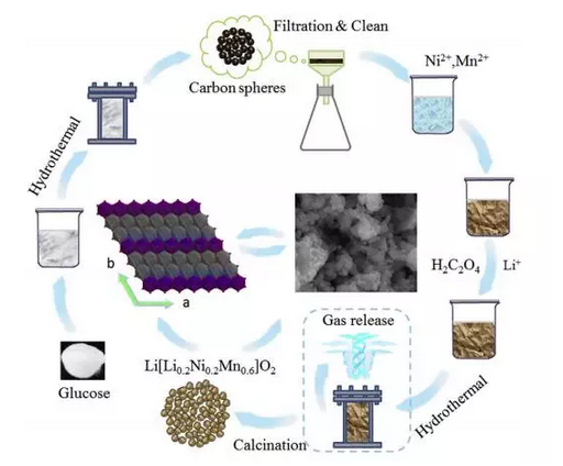 Linjing Zhang利用两步水热法合成了Li[Li0.2Ni0.2Mn0.6]O2材料,该方法主要包含两个步骤,第一步利用葡萄糖在180℃下水热法合成碳微球,作为第二部模板。在第二步水热法合成过程中,以Ni和Mn的醋酸盐作为原料,在450℃下合成富锂材料,通过在其中添加不同的数量的第一步过程所合成的碳微球来改善富锂材料Li[Li0.2Ni0.2Mn0.6]O2的形貌结构,这些添加的碳微球模板在后续的烧结过程中会发生分解,从而不会残存碳材料。