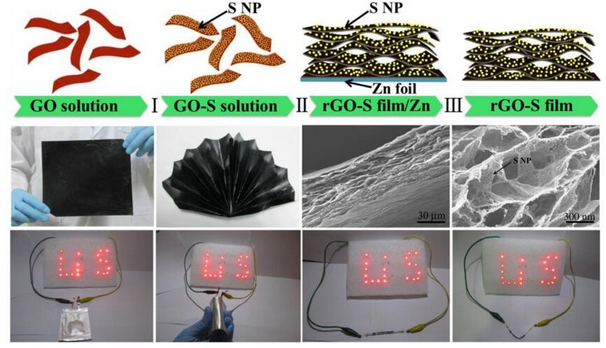 近期,南开大学牛志强研究团队结合原位复合和金属还原自组装的方法制备了自支撑柔性石墨烯/硫纳米复合薄膜,复合物薄膜中石墨烯具有连续的网络状结构,硫均匀分散在石墨烯的表面,石墨烯连续的网络状结构不仅为离子和电子传输提供了有效的途径,还可以有效吸附多硫化物并抑制其溶解。