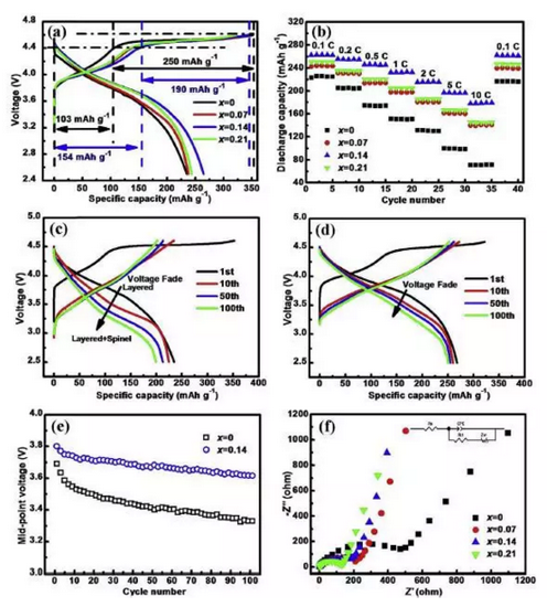 哈尔滨工业大学的Quanxin Ma等人针对富锂材料这些问题进行了掺杂改性实验。Quanxin Ma通过向富锂材料中加入Se元素合成了Li1.2[Mn0.7Ni0.2Co0.1]0.8_xSexO2,实验表明该材料具有良好的倍率性能,在10C的倍率下,比容量可达178mAh/g,并且Se元素掺杂很好的抑制了富锂材料的电压衰降,循环100次,中值电压衰降仅为5%。