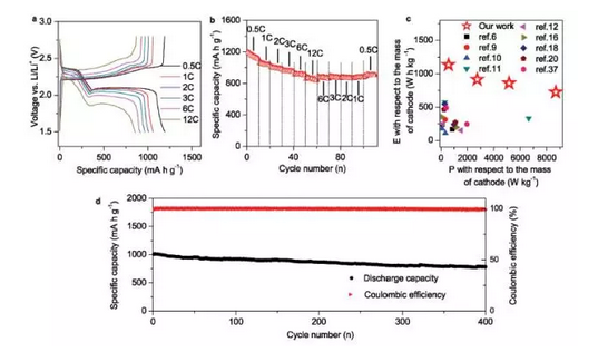 如果将CNT-UGF与负极的锂箔结合,可以将电压滞后减少了14%,在循环800h后仍然没有发生短路,而纯锂箔在260h后就发生了短路。采用CNT-UGF电极结构的锂-硫电池(正极涂布量2.6mg/cm2,S含量47%,负极Li-CNT-UGF复合负极,Li含量为20%)在12C的高倍率下,获得了860mAh/g,功率密度8680W/kg,能量密度达到720Wh/kg。