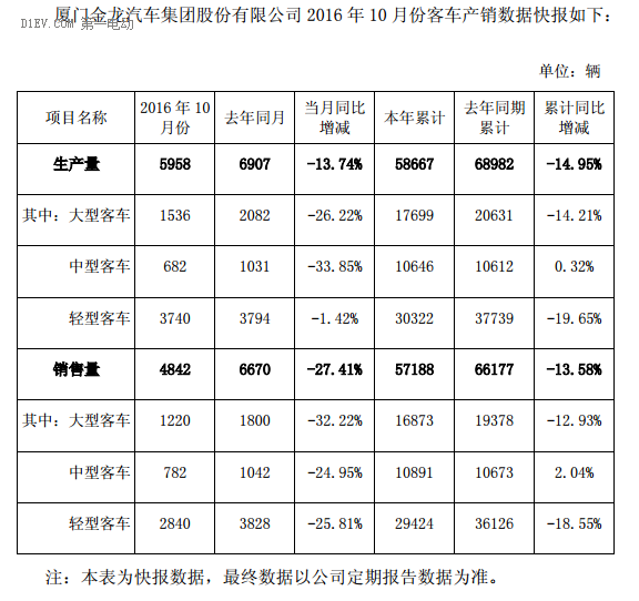 苏州金龙上半年共销售客车9800辆,同比增长13.4%,同期实现营业收入51.98亿元,同比增长30.54%,但净利润仅为5565.85万元,同比下降60.71%。厦门金龙汽车11月10日公布的10月份产销数据显示,10月份销售4842辆,同比减少13.58%。