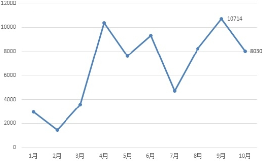 2016年以来,新能源客车产量一直处于波动状态,经过开年前两月的连续小幅减产后,3、4月份再次大幅回升,并在4月突破万辆水平后,至10 月均处在大幅波动状态。2016年1-10月新能源客车累计产量达67037辆,与去年同期(2015年1-10月累计产量56399辆)相比增长19%,实现月产6700辆左右,较之2015年前10月增势明显(2016前10月月均产5600辆左右)。