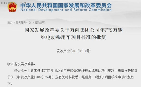 12月20日,发改委行政许可公告,正式核准批复了万向集团公司年产5万辆纯电动乘用车项目。万向集团成为了继北汽新能源、长江汽车、前途汽车、奇瑞新能源和敏安汽车之后,第6家获得新建纯电动乘用车生产资质的企业。