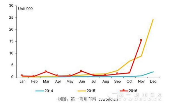 实际上,由于临近年底,最新调整后的新能源汽车补贴政策一直难产,因此,行业普遍认为新政即使发布,也要到2017年才能实施,再加上新能源车推荐目录中首次有纯电动专用车车型(第4批目录一共有244款纯电动专用车入选),12月的纯电动物流车产量冲上4万甚至6万辆的历史最高点,存在很大的概率。