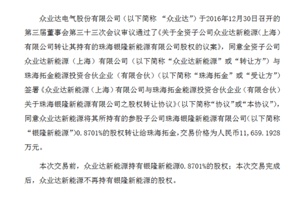 众业达昨日晚间发布公告称,公司全资子公司众业达新能源将所持珠海银隆全部0.8701%股权,转让给珠海拓金能源投资,交易价11,659.1928万元。众业达关于新能源汽车充电领域的战略布局已得到优化,已实现最初入股珠海银隆的初衷,此次股权转让将产生投资收益5659.19万元。