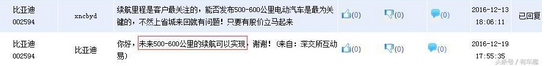 尽管如此,有些车友还是不满意的,要求比亚迪赶紧发布500-600公里的电动汽车。看到这样的信息,比亚迪董秘也给了一个霸气回复。
