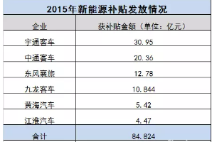 据统计,截止目前,共有6家企业获得2015年国家新能源补助,累计金额84.8亿元,发放情况见下表:
