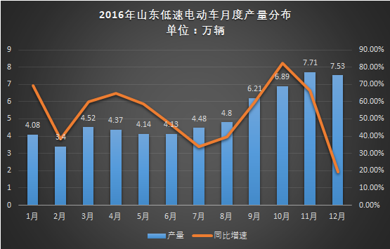 从山东低速电动车月度产出看,2016年前8月保持平稳,产出维持在4万辆左右,从9月开始进入微型电动车产销增长期,与往年规律相似,在第四季度产销量保持高位增长,最高在11月形成产量高峰达7.71万辆,同比增长近70%,12月出现小幅下滑,但依旧保持7.5万辆水平。此前全年山东微型电动车产量可以突破60万辆的预期得以实现。