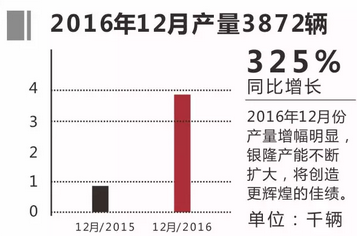 2016年纯电动客车市场排位赛结果揭晓,继2015年以黑马姿态首度进入行业第七后,2016年银隆排位向前递增2位,占据排名榜的前五阵营。数据表明,2016年银隆全年销售纯电动客车订单超过6200辆,较2015年增长110%,其品牌客车已于全国40多个城市运营。