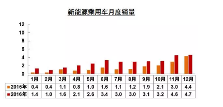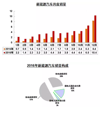 由于受到“骗补”风波、补贴新政迟迟未出台等因素影响,2016年新能源汽车增长速度相对放缓。2016年新能源汽车生产51.7万辆,销售50.7万辆,比上年同期分别增长51.7%和53%。其中纯电动汽车产销分别完成41.7万辆和40.9万辆,比上年同期分别增长63.9%和65.1%;插电式混合动力汽车产销分别完成9.9万辆和9.8万辆,比上年同期分别增长15.7%和17.1%。
