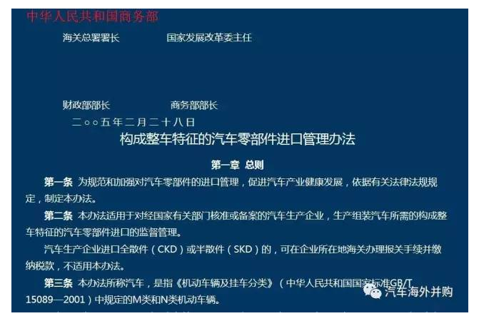 说道提交WTO通报,不仅让人联想到十一年前的2005年4月中国开始实施《构成整车特征的汽车零部件进口管理办法》(简称《整车特征》),该办法规定如果用进口全散件、半散件组装汽车,或进口车身或其他一些总成(系统)装车、或者进口零部件价格综合达到整车总价格的60%及以上的,即被核定为构成整车特征的进口零部件。中国对进口汽车零部件征收10%的关税,但如果价值超过整车的60%后,税率就将调升至25%左右。