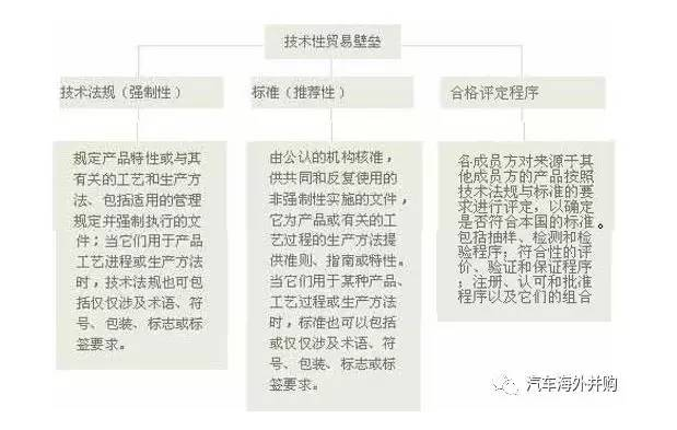《汽车海外并购》和《智能新能源汽车》了解到,就目前来看,国际贸易中各国反应最强烈的基本上还是四类贸易壁垒:绿色壁垒、安全壁垒以及信息技术壁垒,包装和标签,他们或者以标准的形式出现,或者以技术法规的形式,或者以合格评定、检验检疫的形式出现,还有以计量单位制、物品编码、商品的品种、规格、花色、款式和其他外观要求、国家和地区不同的风俗习惯等来达到限制进口、保护本国产业的目的。