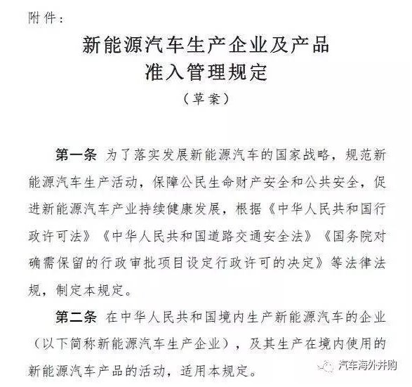 《新能源准入》的通报文件显示,中国即将实施的《新能源准入》内容规定了中国境内新能源汽车生产企业及产品准入的管理办法及审查要求,强调了中国境内新能源汽车生产企业加强安全监管、产品生产一致性等方面的要求,对现有新能源汽车生产企业和产品设定了达到新的规则要求的过渡期。《新能源准入》实施的目的是“提高新能源汽车的安全性能,规范新能源汽车产业发展秩序,以及推动新能源汽车技术进步,”相关文件是GB/T18333.2-2015《电动道路车辆用锌空气蓄电池》等39个标准文件。本法规拟批准的日期是2016年12月30日,拟生效的日期是2017年7月1日。本法规的意见反馈截止日期2016年12月25日。如果各国有意见和建议,可以反馈到位于国家质检总局的中国WTO/TBT国家通报咨询中心。