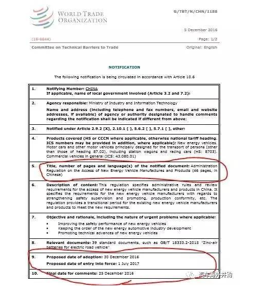 2016年12月11日是中国正式加入世界贸易组织WTO的十五周年纪念日。此前一周的2016年12月5日,中国正式将两项涉及中国新能源汽车行业发展至关重要的两项法规《企业平均燃料消耗量与新能源汽车积分并行管理暂行办法(征求意见稿)》(简称《CAFC+ZEV办法》)和《新能源汽车生产企业及产品准入管理规定(草案)(简称《新能源准入》)提交世界贸易组织技术性贸易壁垒协定委员会进行通报。