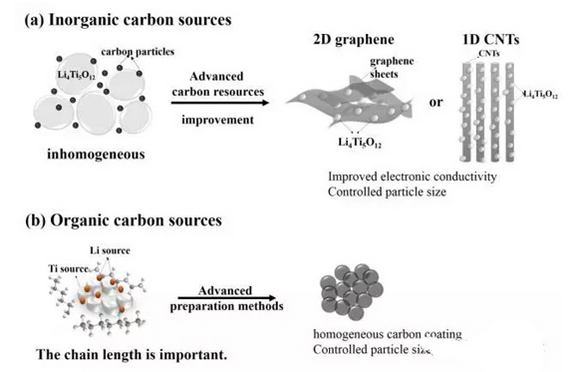 图1 无机碳源和有机碳源制备碳包覆钛酸锂复合材料对比示意图