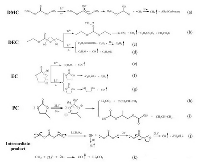 图2 钛酸锂电池中各种电解质溶剂的分解机理