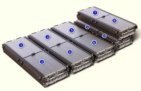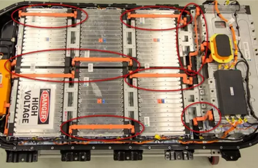 电池包在结构上分为五大区域,每个区域有2个模组。为了能够充分利用电池包内部空间,Bolt的电芯采用横向放置(电芯的宽为338mm,高100mm;VOLT与SparkEV是竖向放置);同时,加热器也没有集成在电池包内。