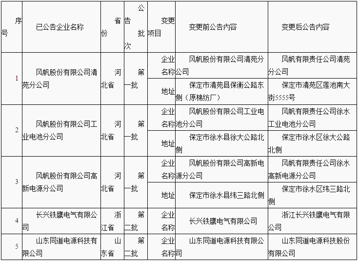 风帆股份有限公司清苑分公司、风帆股份有限公司工业电池分公司、风帆股份有限公司高新电源分公司、长兴铁鹰电气有限公司、山东同道电源科技有限公司分别更名为风帆有限责任公司清苑分公司、风帆有限责任公司徐水工业电池分公司、风帆有限责任公司徐水高新电源分公司、浙江长兴铁鹰电气有限公司、山东同道电源科技股份有限公司。