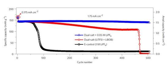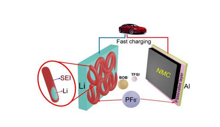 研究人员尝试将已在锂离子电池中使用的盐——六氟磷酸锂(LiPF6,lithium hexafluorophosphate)添加到快速充电电解液中,配置成一款全新的电解液,同时还采用了锂阳极和锂镍锰钴氧化物,于是一款快速、高效、高电压电池就诞生了。