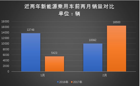 受补贴政策及推荐目录的影响,新能源乘用车市场收窄,销量经历过开年第一个月的大幅下滑后,春节后进入2月开始恢复性回升。据乘联会数据统计,2月新能源乘用车销售1.65万辆,实现环比增长205%,与去年同期相比增长也超过60%。